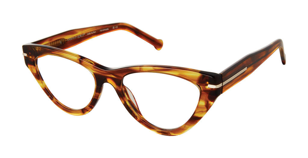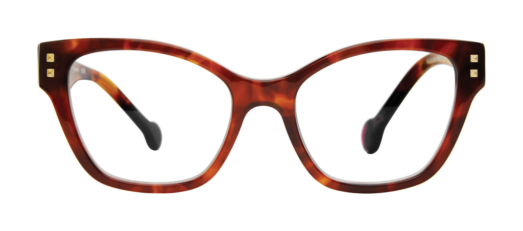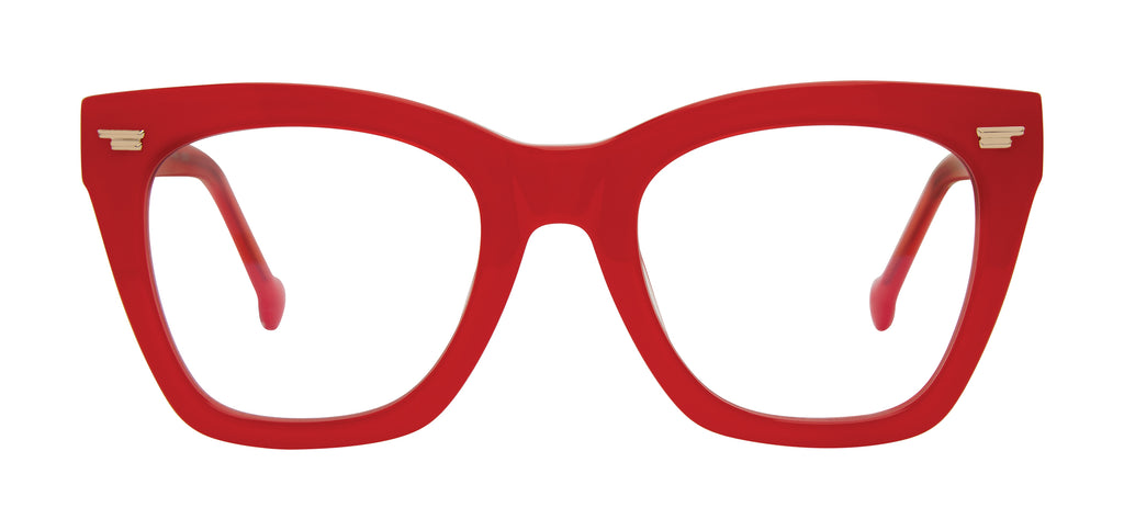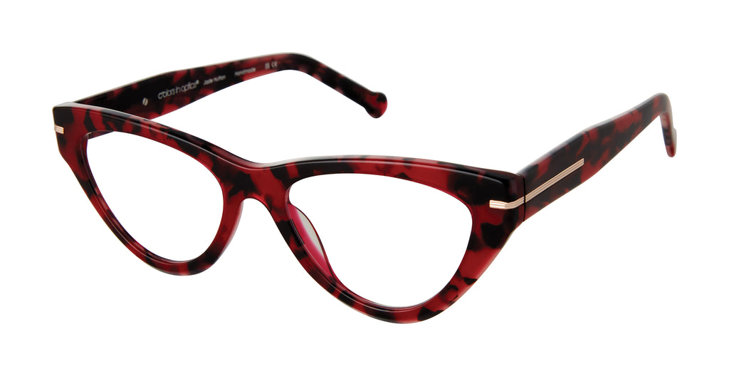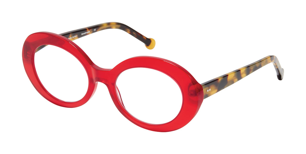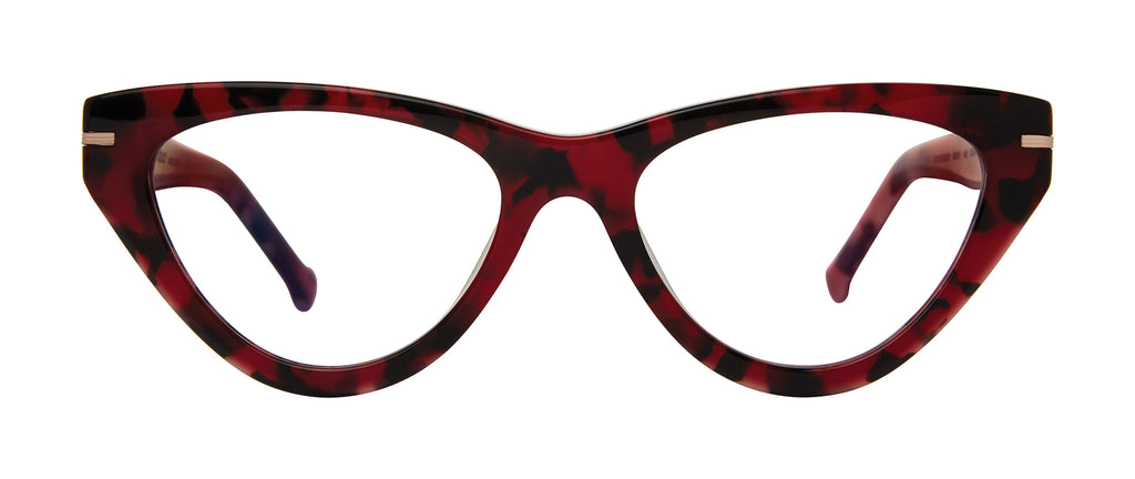 Our feminine, handcrafted Ronnie design, in chunky, Cat Eye contours, offers the added benefit of an elegant upswept, uplifting effect. Featuring an elegant red and blue shimmer.