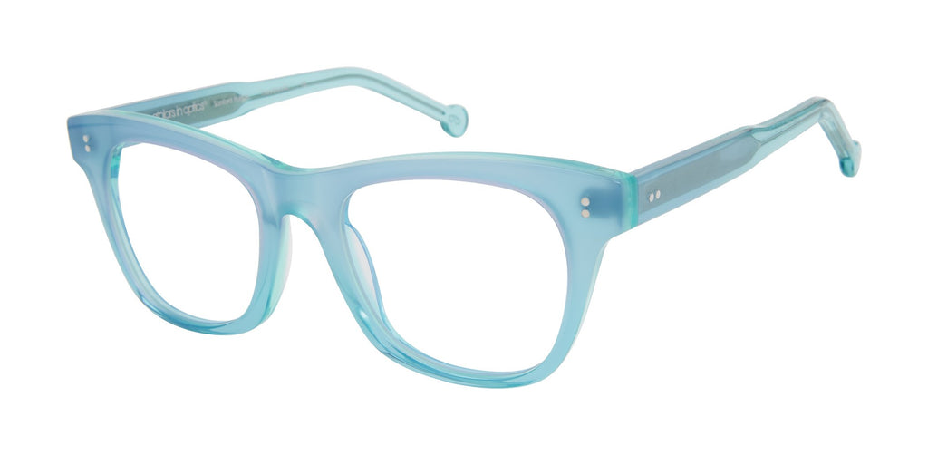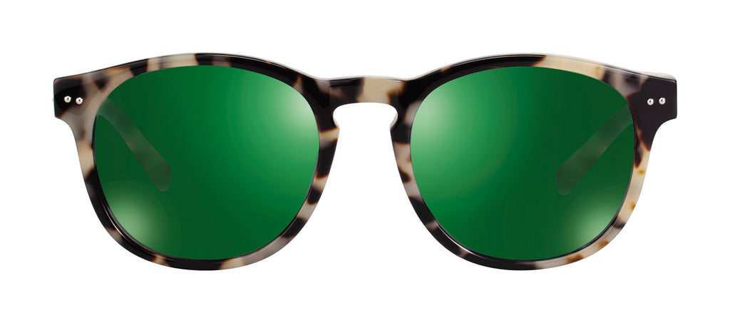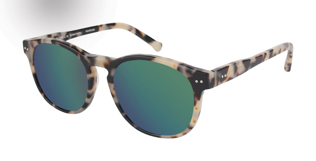 The 90’s are back, perfectly recreated in South Beach, a classy, modified oval shape. The chunky frame is detailed with metal insets imbedded in the front end piece. Dreamy Seafoam Ice with tonal Seafoam lenses tops a smart looking palette. Handmade.