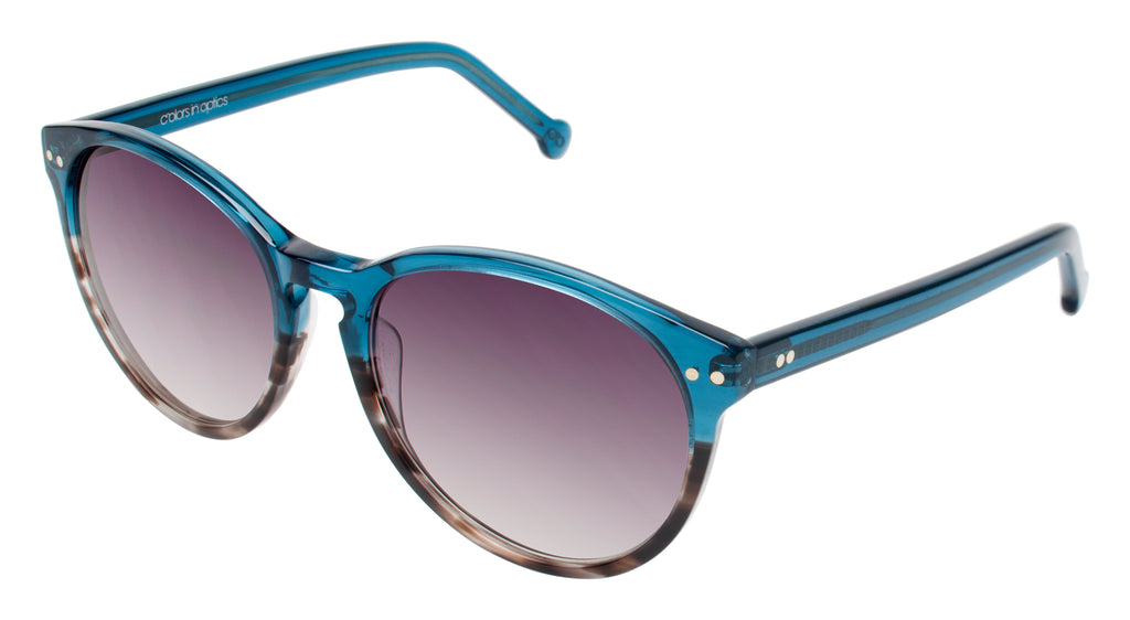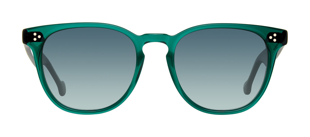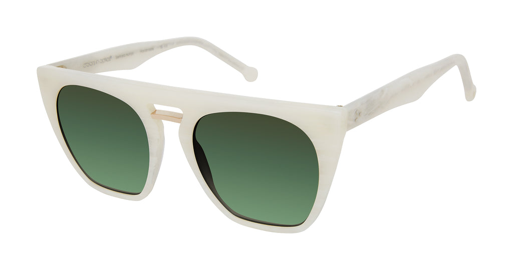 The 90’s are back, perfectly recreated in South Beach, a classy, modified oval shape. The chunky frame is detailed with metal insets imbedded in the front end piece. Dreamy Seafoam Ice with tonal Seafoam lenses tops a smart looking palette. Handmade.